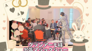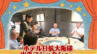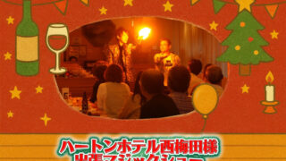 今回は大阪市内の名門ホテル「ヒルトンホテル大阪」にて開催された、ロータリークラブ様主催のクリスマス家族会に出演させていただきました。華やかな会場と温かい雰囲気の中、幅広い年代の皆さまにマジックを楽しんでいただきました。