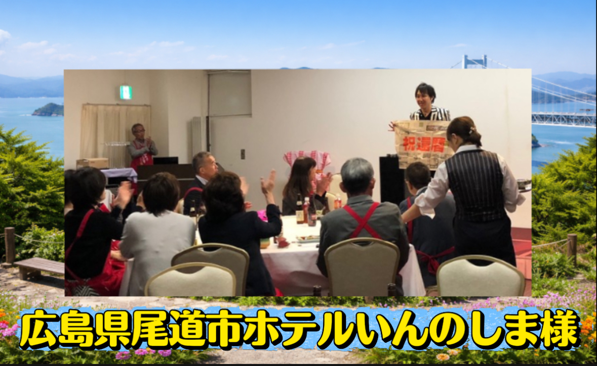 今回の会場は、広島県尾道市・因島にある「ホテルいんのしま」。 お祝いムードに包まれた会場で、主役の方を囲みながら和やかなパーティーが行われました。