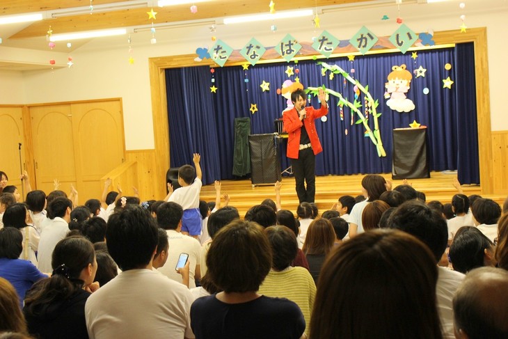 七夕の飾り付けが施されたステージで、園児たちが床に座ってワクワクしながらショーを待ってくれていました。