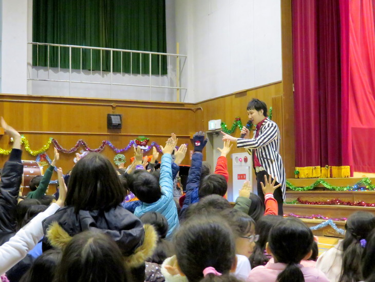 ステージにはクリスマスの装飾が施され、サンタクロースやトナカイの イラストが並ぶ華やかな雰囲気。 オープニングから子ども達の視線は釘付けになりました。