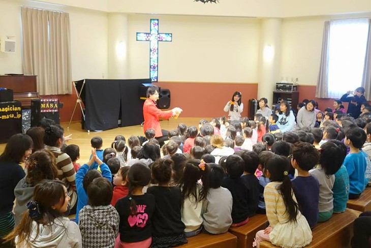 園児のみなさんが前方に集まり、目をキラキラさせながらスタートを待ってくれていました。クリスマスならではの雰囲気とともに、マジックの不思議な世界が広がります。