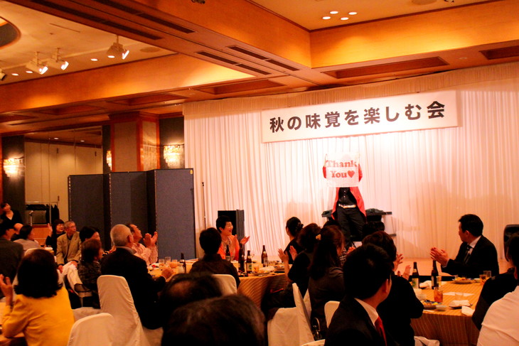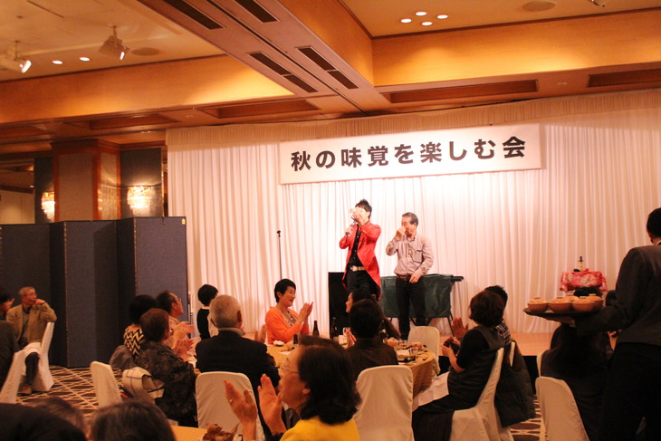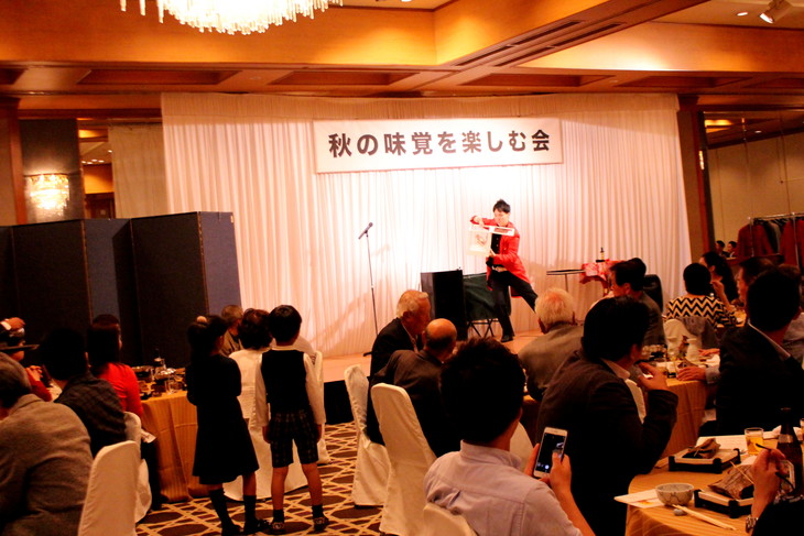 今回の会場は、落ち着いた雰囲気と広々とした宴会場が魅力のホテルきららリゾート。 秋の味覚を楽しむ会として、多くの参加者が集まる中でのステージショーとなりました。