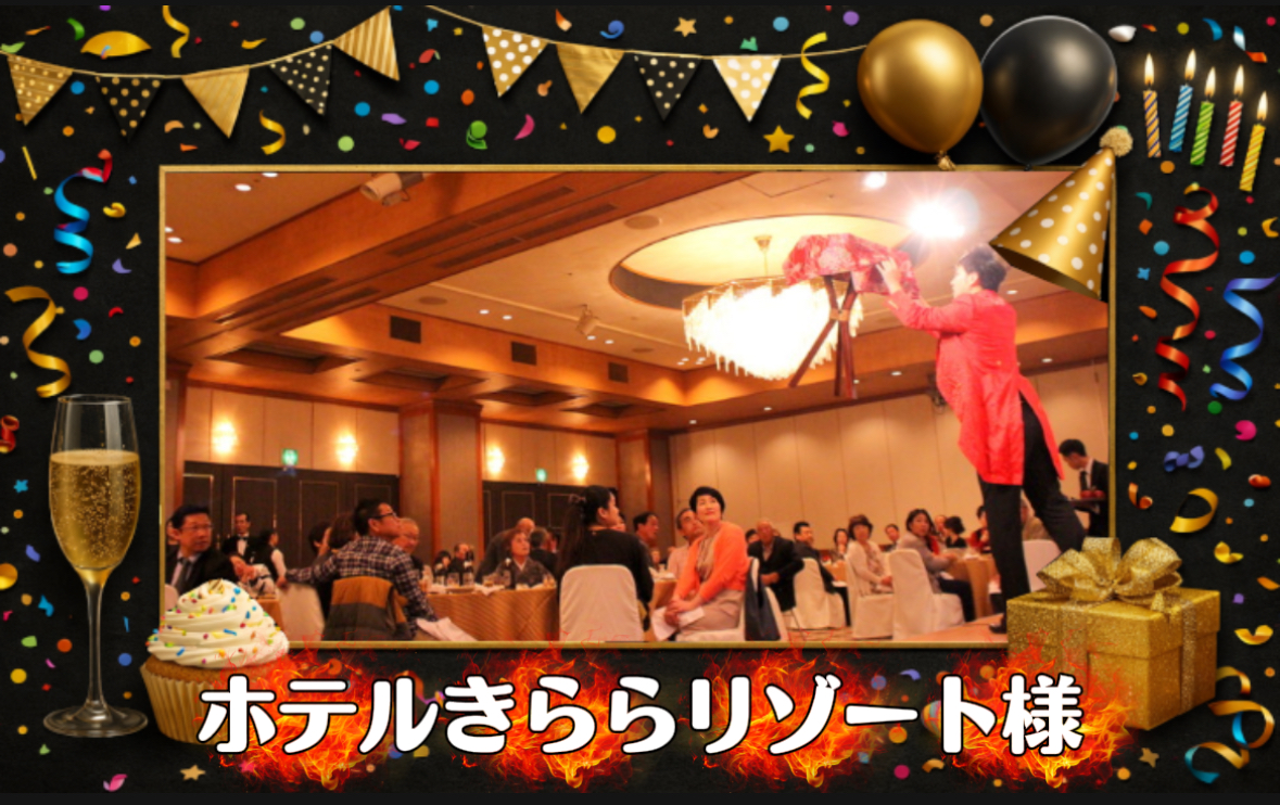 大阪府にあるホテルきららリゾートにて、「秋の味覚を楽しむ会」の催しとして ステージマジックショーを実施しました。 お食事を楽しみながら観覧できるイベントとして、幅広い年代のお客様にご参加いただきました。