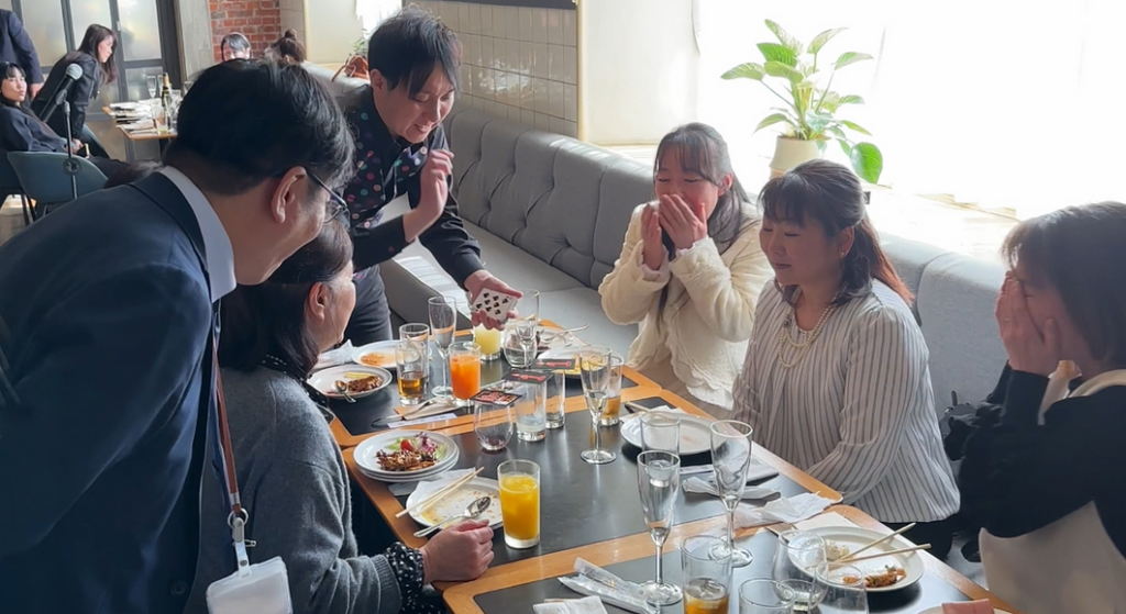 マジックは単なる余興ではなく、人と人をつなぐコミュニケーションツール。 同じテーブルの方はもちろん、周囲のテーブルからも拍手や歓声が上がり、自然と一体感が生まれました。