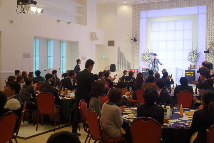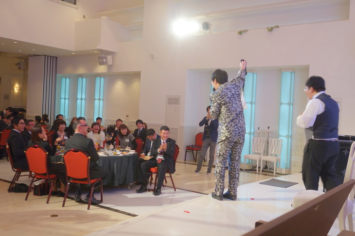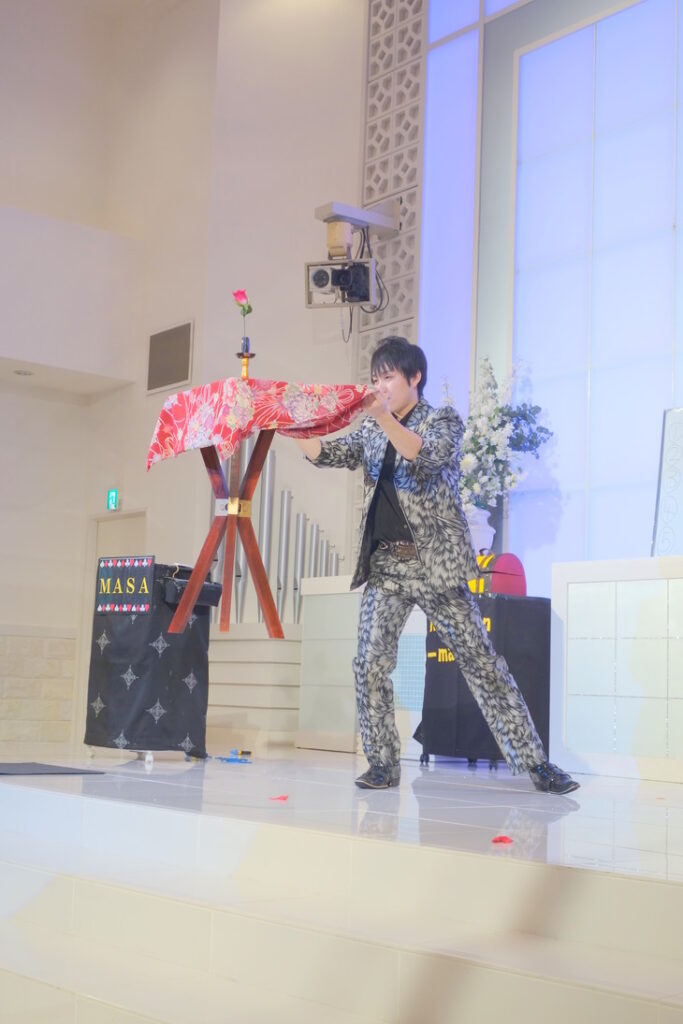 フィナーレでは、ステージ全体を使った迫力あるイリュージョンを披露。 客席からも「すごい!」「どうなってるの!?」と驚きの声が上がり、パーティーの締めくくりとして最高の盛り上がりとなりました。