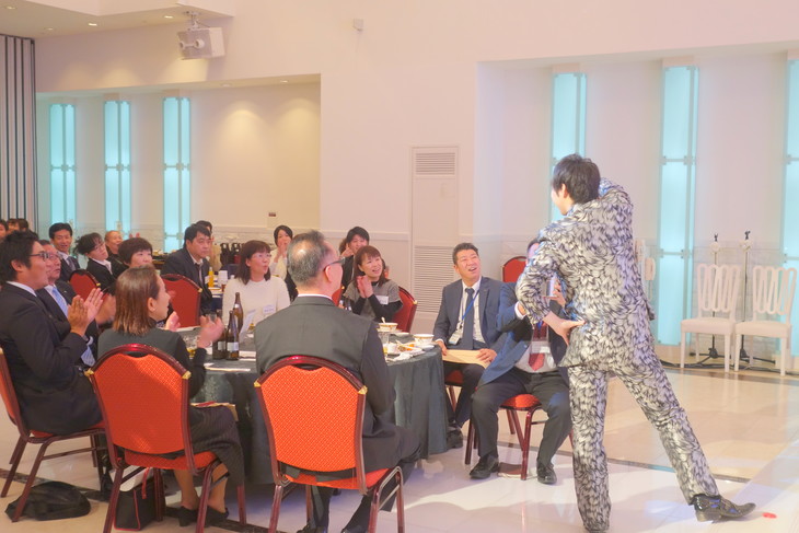 ステージだけでなく、会場の雰囲気を見ながら各テーブルを回り、間近で楽しめるマジックも披露。 「近くで見てもわからない!」と大好評で、社員様同士の会話が弾む人気の演出です。
