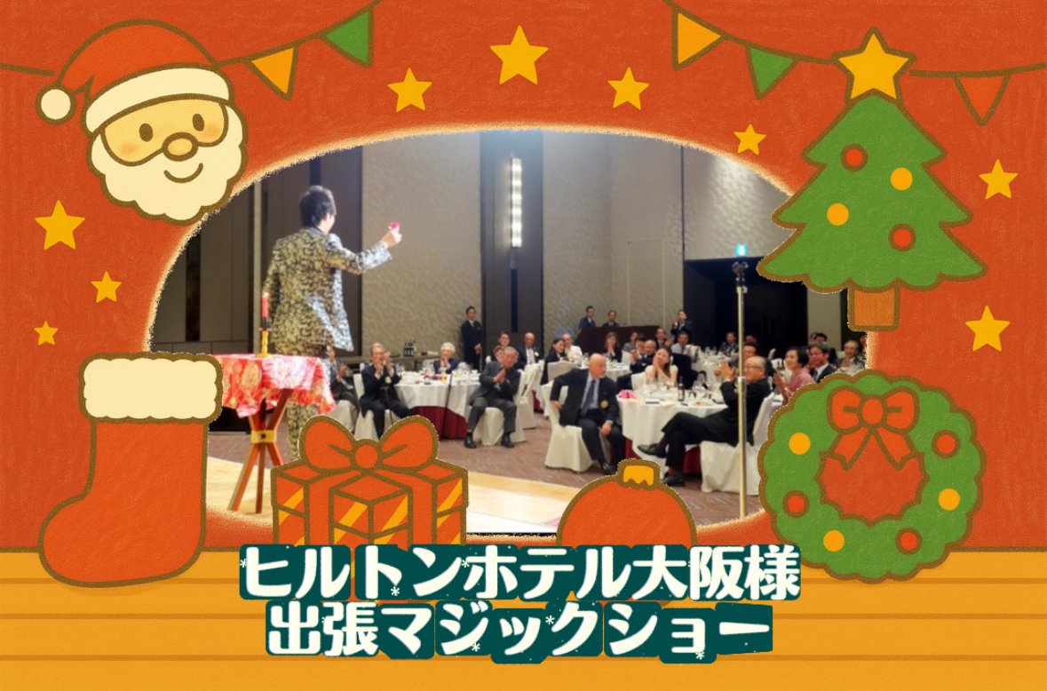 今回は大阪市内の名門ホテル「ヒルトンホテル大阪」にて開催された、ロータリークラブ様主催のクリスマス家族会に出演させていただきました。華やかな会場と温かい雰囲気の中、幅広い年代の皆さまにマジックを楽しんでいただきました。