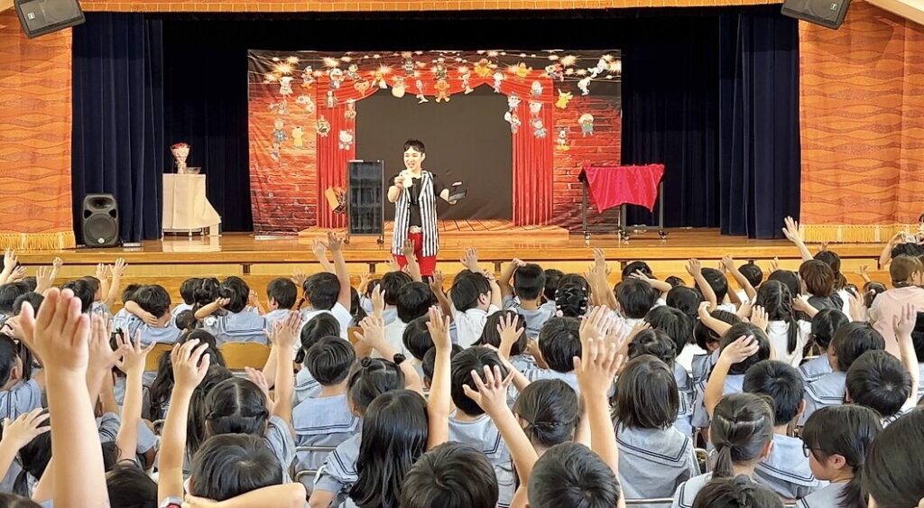 子どもたちに大人気のキャラクターが、マジックによって突然登場する演出では、 驚きと歓声が一気に会場に広がりました。 小さなお子様でも安心して楽しめる内容で、先生方にも大変ご好評をいただきました。