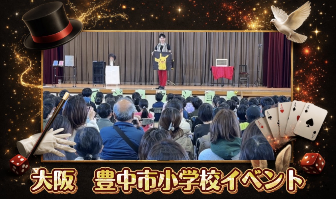 大阪府豊中市内の小学校にて開催された「創立記念イベント」に、 マジシャンMASAをお招きいただきました。 全校生徒・保護者の皆さまが集まる大規模イベントとなり、 体育館はスタート前からワクワクした空気に包まれていました。